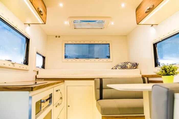 速腾DAILY拓步者四驱越野房车车身整体采用航空铝轻量化车身设计,进入房车内部,欧式简约风格设计让您感觉到质的存在,四人对坐沙发及电动升降餐桌可秒变豪华双人床,多功能一体式厨具操作空间可满足您所有日常生活需要;