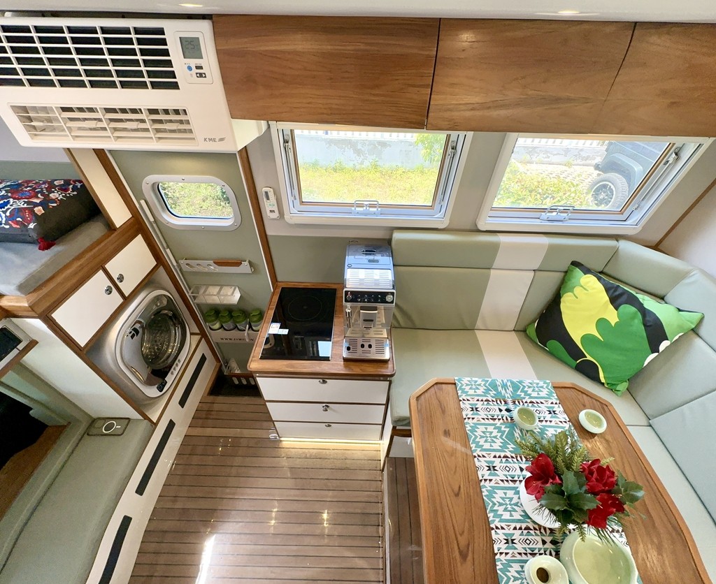 中部中置卫浴间,进口美国 Maxxfan 正反转换气扇、一体式淋浴花洒组合、房车专用水盆及水龙头,洁净卫生,舒适如一。全进口房车专用游艇级电绞碎马桶的配置,直接让如厕体验产生质的提升,排污更方便,如厕更舒适卫生,室内环境也能保持在干净整洁的氛围中。