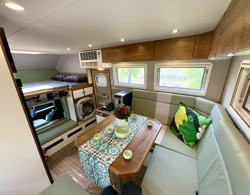 旅美灵域5500U四驱越野房车硬顶结构,专业越野房车铝骨蒙皮设计,车厢坚实稳固,保温隔热隔音。车辆内部是不同于以往车型的设计,入门右手边房车的卧室区域,2100mm*1500mm左右的房车前额头可伸缩式的豪华大床,提供更舒适的睡眠环境;下方还有韩国mini洗衣机,方便换洗衣物。