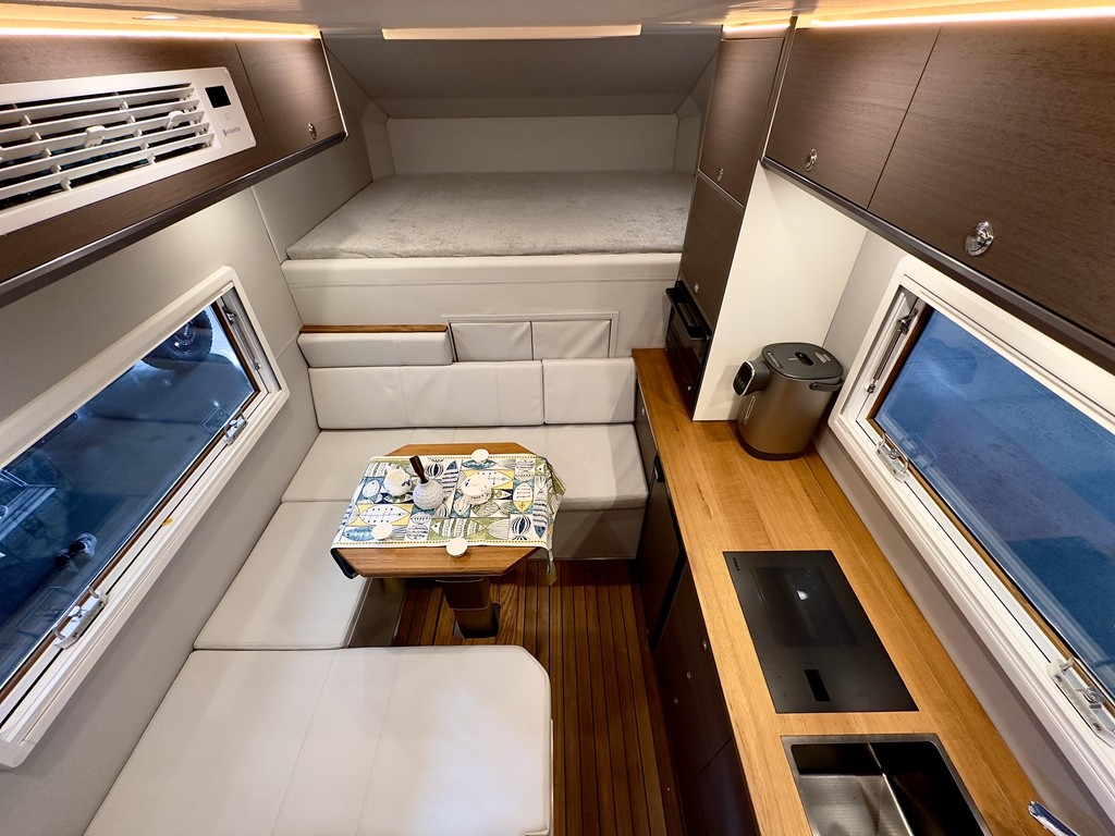 进入内部空间中,功能区域划分依然传承了旅美房车经典的会客厅、卧室、厨房、卫浴间等功能布局,升级的则是在细节打造方面。在卧室区域,2.1m*1.5m左右的前额头大床,带来高质量的睡眠体验。中部是U型对坐的卡座,可以吃饭聊天打牌,同时也是家里的第二张床,尺寸是1米2×1米9左右,让一个空间兼具多个功能属性。后上门设计,功能分区更高效,空间利用率最大化,值得一提的是,环绕车顶左右两侧的是储物吊柜,优质的实木面板和精致的做工,都彰显了旅美房车品牌的匠心特质,而冷暖变频空调很好的隐藏在其中,既能够发挥其制暖制冷的功能属性,又可以美化空间,增加车型内的美观度和空间舒适度,把更多生活空间留给车友。车顶部还有全景天窗,增加视野通透性和空间通风性。