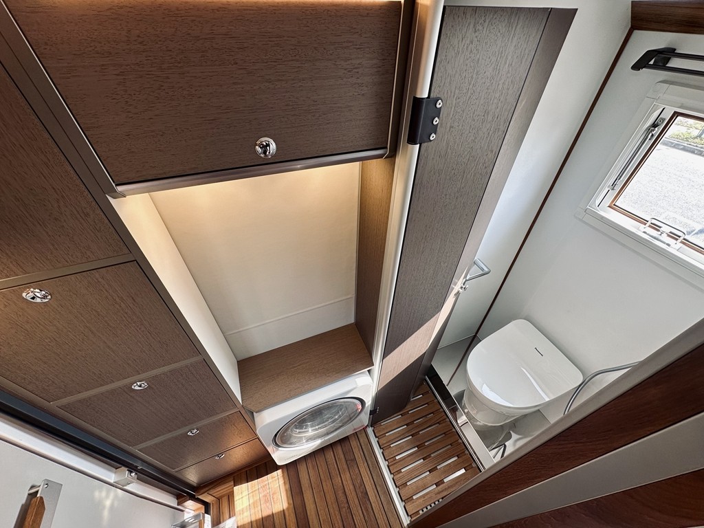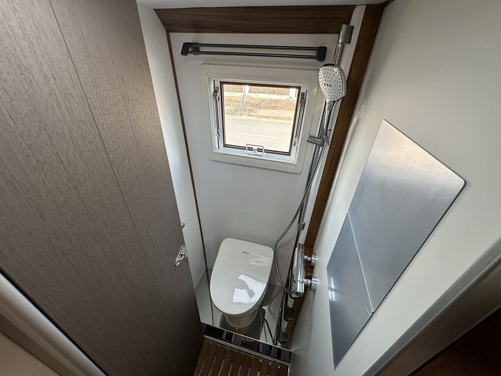 卫浴间部分,房车专用独立式淋浴间设计,配备进口美国 Maxxfan 正反转换气扇、房车专用电搅碎马桶及智能马桶盖,如厕时温暖的马桶盖感觉更舒适,还有清洗功能满足个性化需求。一体式淋浴花洒组合,洗澡更便捷。