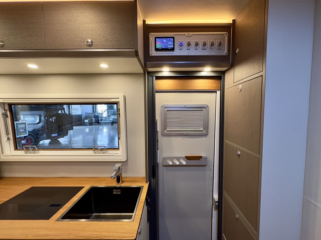 水电设计部分,依然秉承大水、大电、脱离营地的越野旅行概念,并力求做到继续精进一步,因此其拥有纯钛水箱 170L 冷水箱、房车专用 60L 灰水箱房车专用重力带锁加水口,水量充足,满足野外露营生活。整车11度电,210AH 48V 磷酸铁锂电池及 BMS 电池管理系统、荷兰进口VICTRON充逆变一体系统4500W, 700W 房车太阳能板、220V 房车专用外接电源接入口,电器随心使用再也不怕找不到电力供给了。